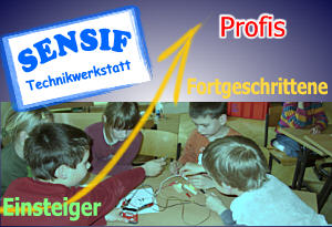 Speziell an die Absolventen unserer Kurse SENSIF-Technikwerkstatt richtet sich nach einem Wechsel von der Grundschule an eine Mittelschule oder ans Gymnasium unsere Elektronik-AG. Diese wird entweder im Rahmen von GTA an der betreffenden Schule durchgeführt, oder kann in unserer Vereinswerkstatt besucht werden. Natürlich steht die Arbeitsgemeinschaft auch allen anderen elektronikinteressierten Kindern und Jugendlichen offen.