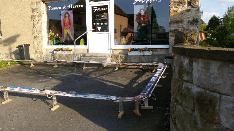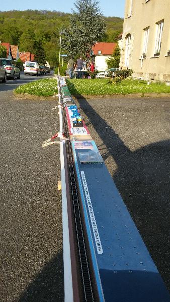 Am 5. Mai 2016 zum Himmelfahrtstag fand der jährliche Testaufbau unseres Rekordversuches statt. Das bedeutet, alle Module welche wir in der Werkstatt lagern, und einige Weitere, welche wir von den "METER-Besitzern" draußen extra für diesen Tag zu uns holen, werden zu einer Gesamtstrecke zusammengebaut. Tage vorher wird jeder einzelne METER, jedes Kurvensegment und das Steuermodul gesichtet, gereinigt und evtl. repariert. Das alles ist natürlich ohne Hilfe nicht mehr machbar. Daher ganz besonderen Dank an Patrick, Richard, Roland, Marko und Carsten. Dieses Jahr ergab sich eine Gesamtstrecke von exakt 92,12 Metern. Einmal ums halbe Haus, und dann vor dem Haus noch einmal "gefaltet".