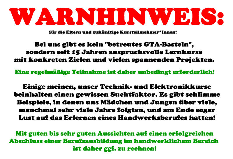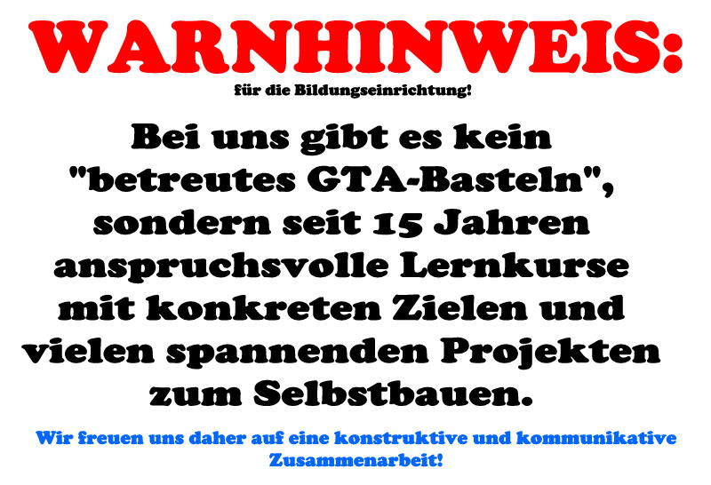 Auf Grund der umfangreichsten Kürzungen für GTA-Mittel welche es in der Vergangenheit gab, sind nun fast alle Ganztagsangebote unserer Elektronik- und Technikwerkstatt abgesagt. Das betrifft zum Beispiel auch unsere Kurse an der Diesterweg-Grundschule in Pirna. Seit 2009 - alo insgesamt 15 Jahre lang standen wir dort wöchentlich vor voll belegten Kursen mit interessierten Mädchen und Jungen. Nun ist Feierabend. Bereits 2024 betraf das die Evangelische Grundschule in Pirna. Seit 2010 - also 14 lange Jahre - waren wir regelmäßig vor Ort. Schade!